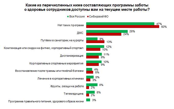 На четвертом месте – диспансеризация (9% – в Сибири, 11% – в целом по РФ), на пятом – корпоративные спортивные мероприятия (9% – в Сибири, 10% – в целом по РФ).