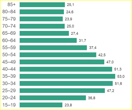 По мере взросления доходы планомерно растут и достигают пика — 53 тыс. рублей — в 35–39 лет. Чуть меньше — 52,3 и 51,6 тыс. — расходуют россияне 40–44 и 30–34 лет соответственно. Эксперты СберИндекса связывают такую статистику как с высокими затратами на обустройство жилья, детей и другие сферы жизни, так и с пиком доходов, который приходится на этот период жизни.