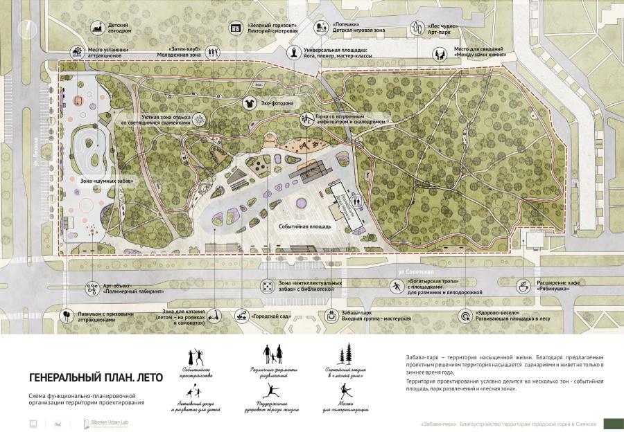 На площадке планируется сохранить лесной массив. Планируется, что парк станет местом для встреч, прогулок и активного отдыха. Согласно проекту, территория будет разделена на несколько зон, в том числе место для свиданий, арт-парк, место для шумных забав, аттракционов, молодежи, зоны для катания на самокатах и бега, а также многие другие.