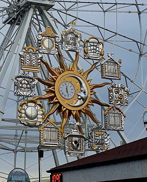Часы довольно крупные – они занимают примерно пятую часть колеса обозрения. Объект окрашен в золотой и серебряный цвета. В его центре размещены солнце и луна, а вместо цифр установлены закрытые окошки: при наступлении нового часа нужное окно будет открываться, а из него под музыку появится один из сказочных персонажей. Каждый будет находиться в движении, выполнять определенные действия, предусмотрены и световые эффекты.
