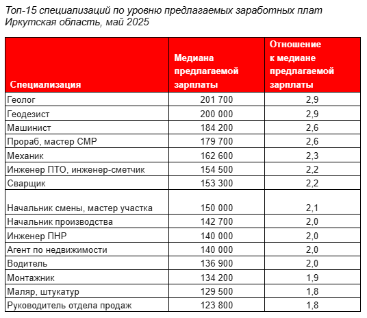 Аналитики выявили 15 профессий в Иркутской области, где зарплаты в 2-3 раза превышают среднерыночный уровень в 70 тыс. рублей. Лидерами стали геологи с медианной зарплатой 201,7 тыс. рублей и геодезисты с 200 тыс. рублей.