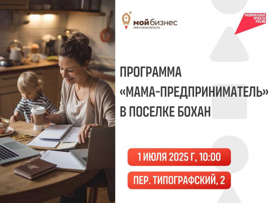 1 июля центр "Мой бизнес" приглашает на образовательную программу «Мама-Предприниматель» в поселке Бохан.