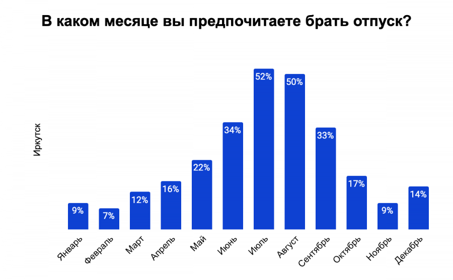 Большинство жителей Иркутской области пока только выбирают варианты для летнего отдыха. Самыми популярными месяцами для отпуска традиционно стали июль и август, которые предпочитают более половины опрошенных.