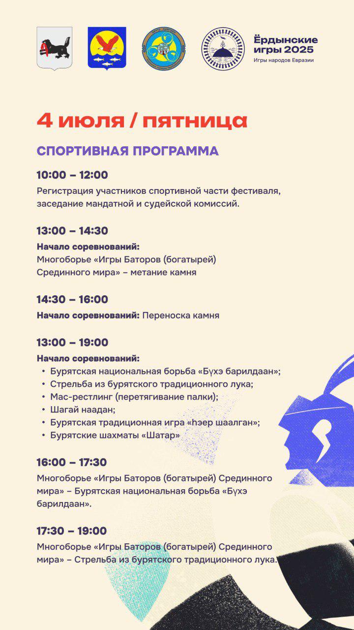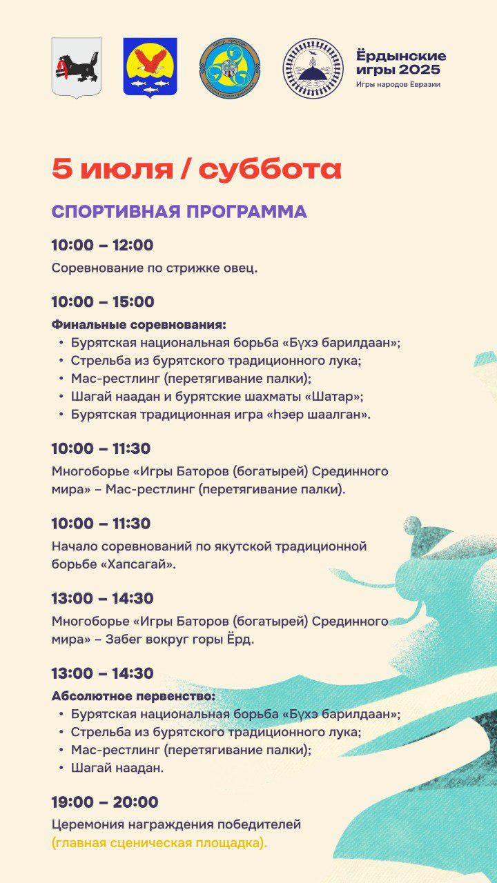 В спортивную программу войдут бурятская национальная борьба, стрельба из традиционного лука, перетягивание палки, якутская национальная борьба «Хапсагай», переноска камня, соревнования по стрижке овец и многое другое. Главным состязанием игр станет спортивное многоборье «Игры Баторов (богатырей) Срединного мира». В соревнованиях примут участие 12 команд из российских регионов и Монголии.