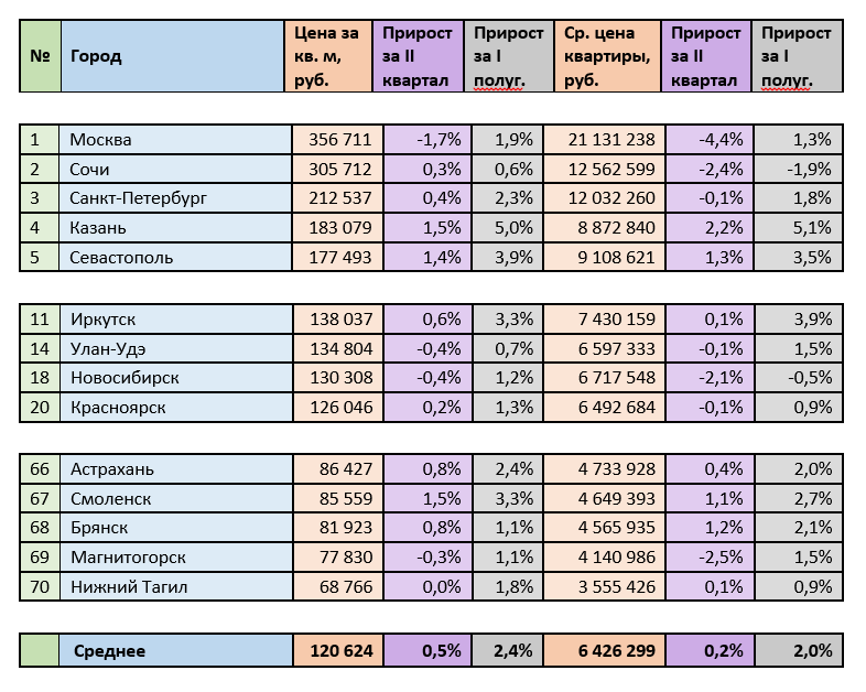 В среднем по стране «квадрат» подорожал на 2,4%, а стоимость типовой квартиры выросла на 2%. Краснодар стал антилидером по падению цен – минус 4% за полгода, тогда как в Курске собственники смогли продавать жилье на пятую часть дороже.