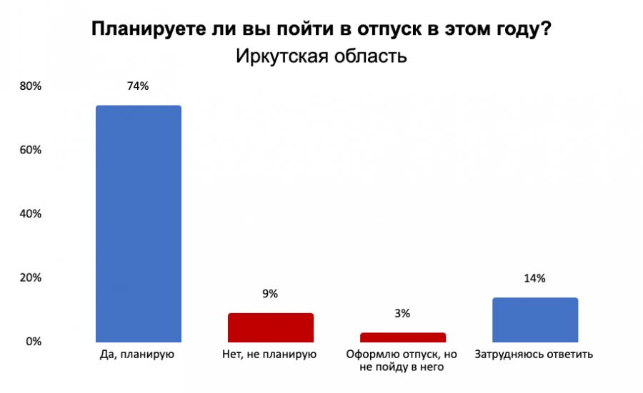 Согласно исследованию hh.ru, 16% работников в Иркутской области сталкивались с ситуацией, когда работодатель настаивал на использовании отпуска. При этом 12% респондентов вообще не планируют отдыхать в этом году.