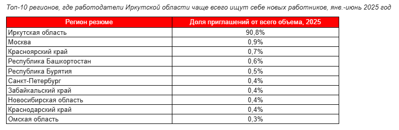 Аналитики hh.ru выяснили, что компании Иркутской области в 2025 году чаще всего приглашают на вакансии кандидатов из своего региона. Лишь 9,2% предложений о работе получили соискатели из других субъектов России.