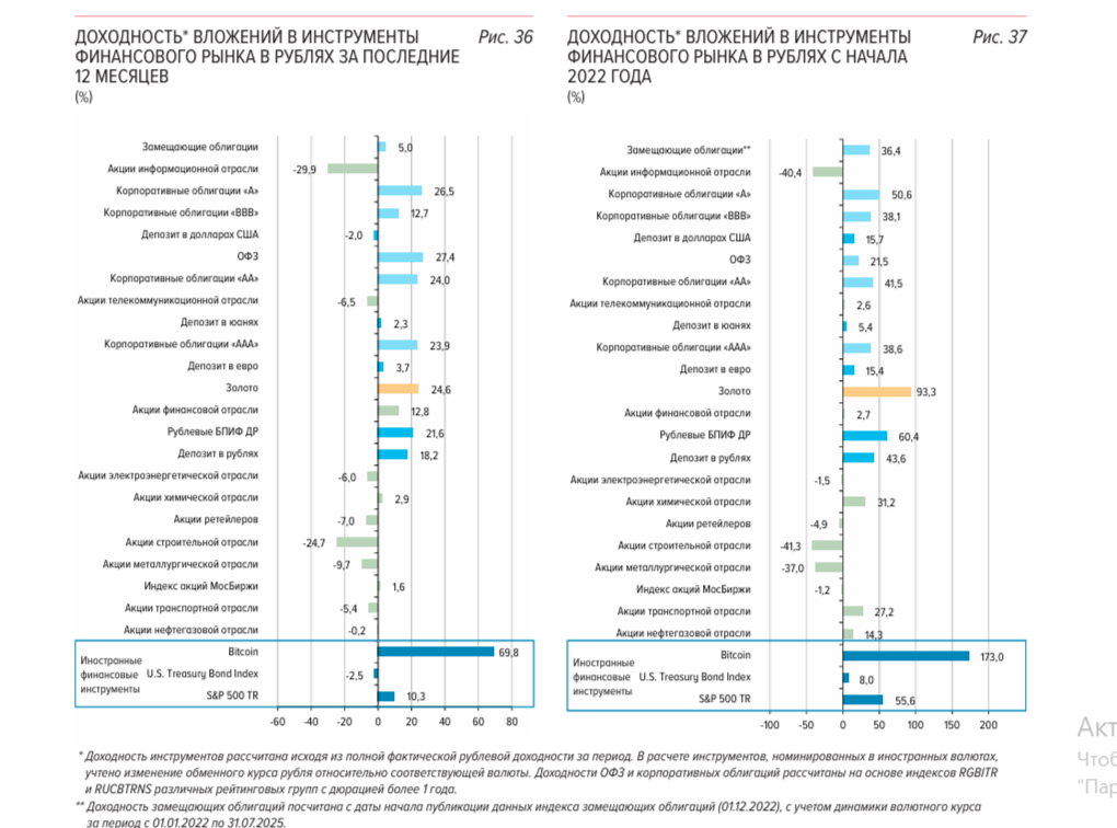 Золото, долгое время лидировавшее по доходности среди активов на 12-месячном горизонте, уступило место облигациям федерального займа (ОФЗ) и корпоративным облигациям. Согласно «Обзору рисков финансовых рынков» Банка России за июль 2025 года, ОФЗ обогнали золото и корпоративные облигации с рейтингом «А», став самым доходным активом среди российских инструментов с доходностью 27,4%. Корпоративные облигации «А» показали доходность 26,5%, а золото — 24,6%.