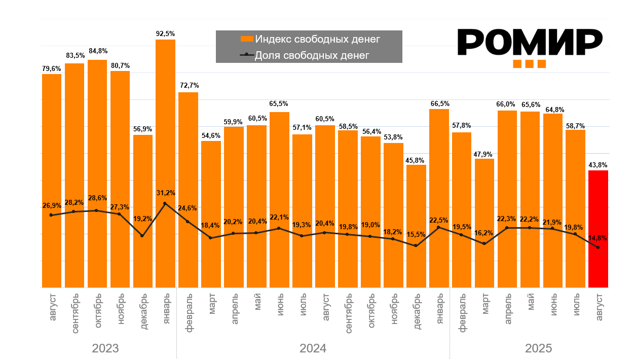 Согласно данным исследовательского холдинга Ромир, доля свободных денег в бюджете среднестатистической российской семьи в августе 2025 года составила 14,8%.