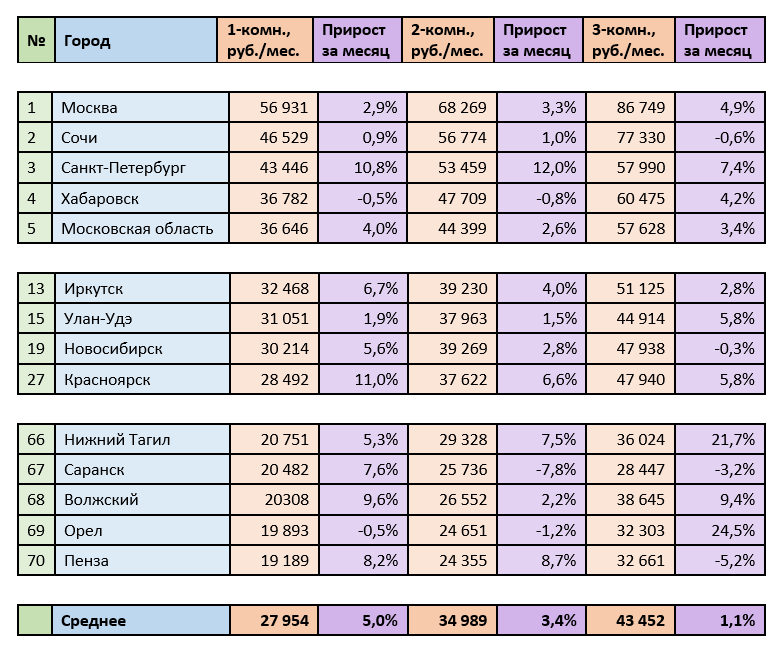 Среднероссийские показатели составляют 27,9 тыс. рубля (+5,0%) за однокомнатную квартиру, 34,9 тыс. рублей (+3,4%) за двухкомнатную и 43,4 тыс. рубля (+1,1%) за трехкомнатную. Иркутск превышает средние значения по стране: на 16,1% для однокомнатных, на 12,1% для двухкомнатных и на 17,7% для трехкомнатных квартир.