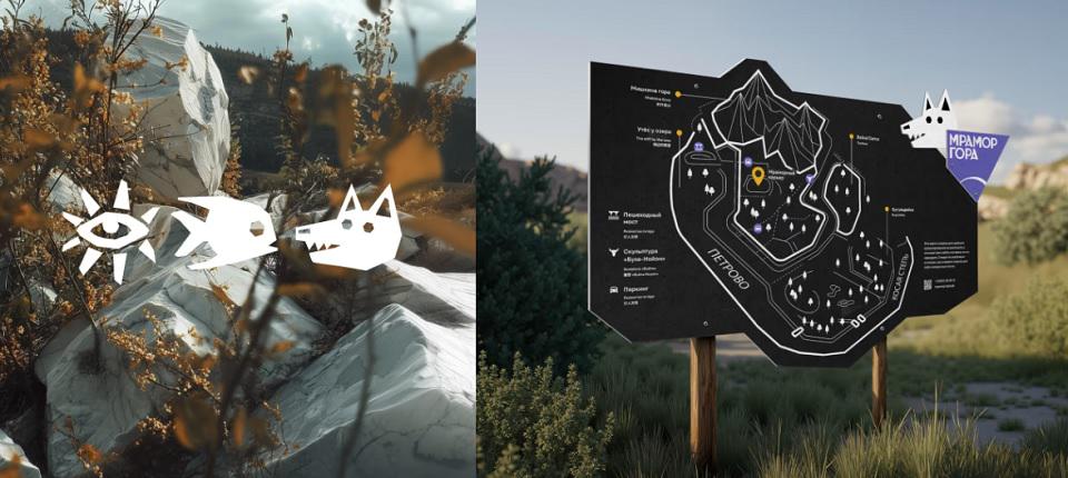 Придуманы также логотип и айдентика. Визуальная система строится на текстурах камня, природных мотивах и графике, связанной с локальной культурой и искусством. При ее разработке использовались технологии искусственного интеллекта, в частности, нейросети – MidJourney, ChatGPT. Наработки предлагается применять при создании медиа-арта, мерча, промо-материалов, информационных табличек и стендов, при оформлении мероприятий.