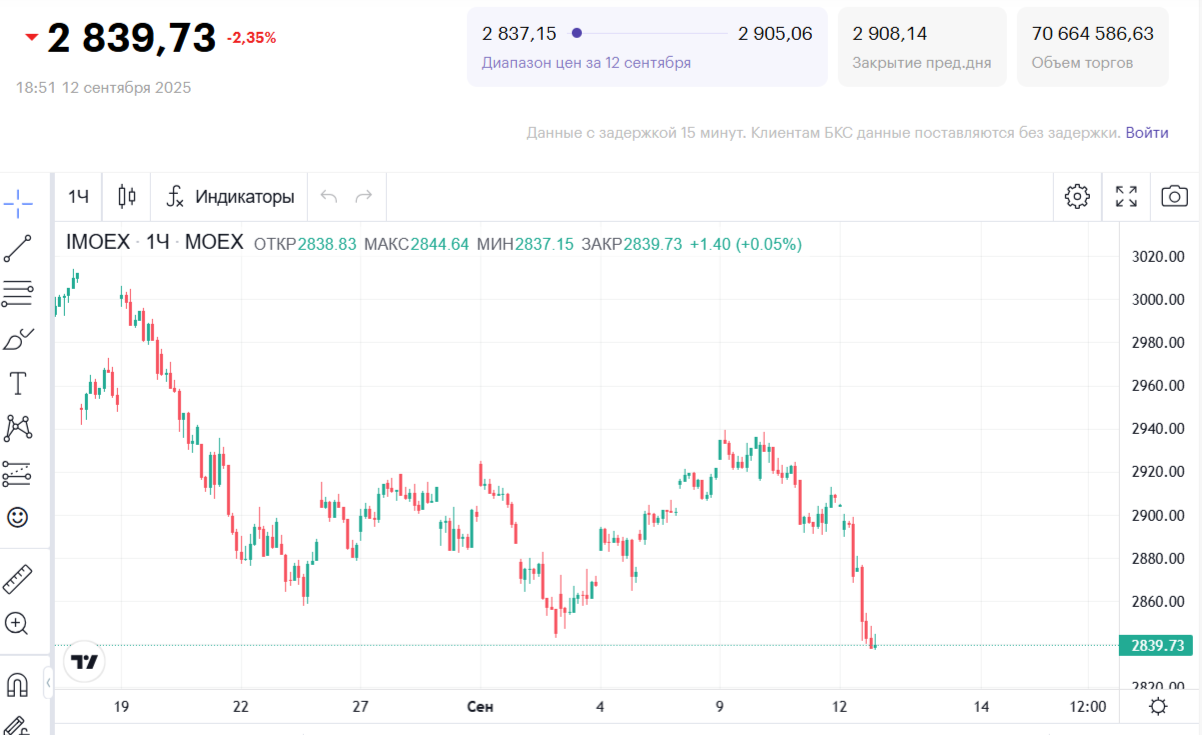 Индекс МосБиржи в пятницу, 12 сентября, резко упал, достигнув 2838 пунктов, что связано с неожиданно жестким решением ЦБ по ключевой ставке и увеличением санкционных рисков. Снижение ускорилось после разочаровывающего решения Банка России, которое обновило месячный минимум и привело к серьезным потерям.