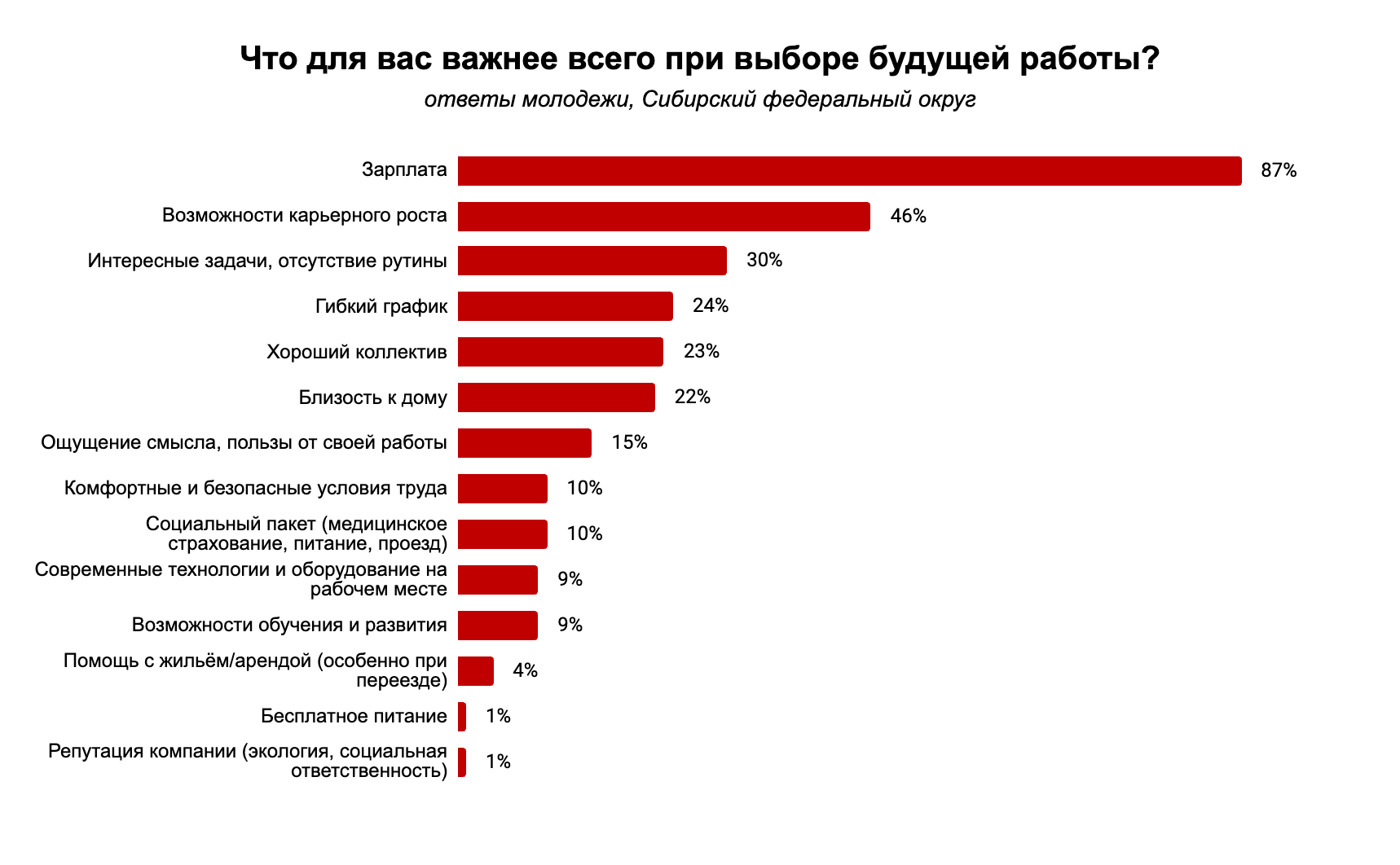 По данным опроса, самыми важными критериями выбора работы для молодежи из Сибирского федерального округа, помимо зарплаты (87% отметили этот вариант), являются возможности для карьерного роста (46%). Эти приоритеты полностью совпадают с общероссийскими. На третьем месте по важности у жителей СФО оказались интересные задачи и отсутствие рутины (30%), тогда как в целом по РФ в тройку важнейших попал хороший коллектив, у местных же зумеров этот критерий находится на 5-м месте (23%).