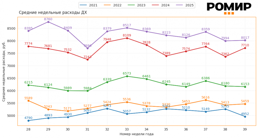 Согласно данным исследовательского холдинга Ромир, на 39-й неделе 2025 года с 22 по 28 сентября зафиксирован рост недельных расходов российских семей на продукты питания и товары повседневного спроса. Среднестатистическая семья потратила 8017 рублей, что на 23 рубля больше показателя предыдущей недели.