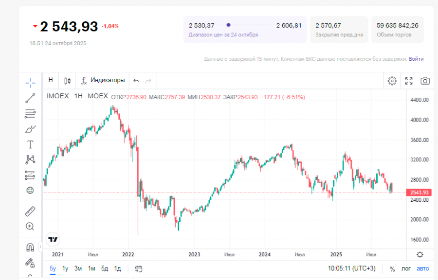 «Закрытие недели оказалось слабым. Утраченный трёхлетний тренд роста стал важным уровнем сопротивления — зона около 2580 пунктов. Следующая ближайшая поддержка находится на отметке 2520 пунктов, ниже неё расположены психологически важные круглые цифры — 2500 пунктов. Несмотря на значительную степень перепроданности активов, устойчивый сигнал к развороту пока отсутствует. Долгосрочная цель на уровне 3300 пунктов представляет собой потенциал роста примерно на 30%, однако ориентированы на этот сценарий лишь инвесторы, готовые смириться с временной повышенной волатильностью и имеющие долгосрочную инвестиционную стратегию», — делают вывод аналитики.