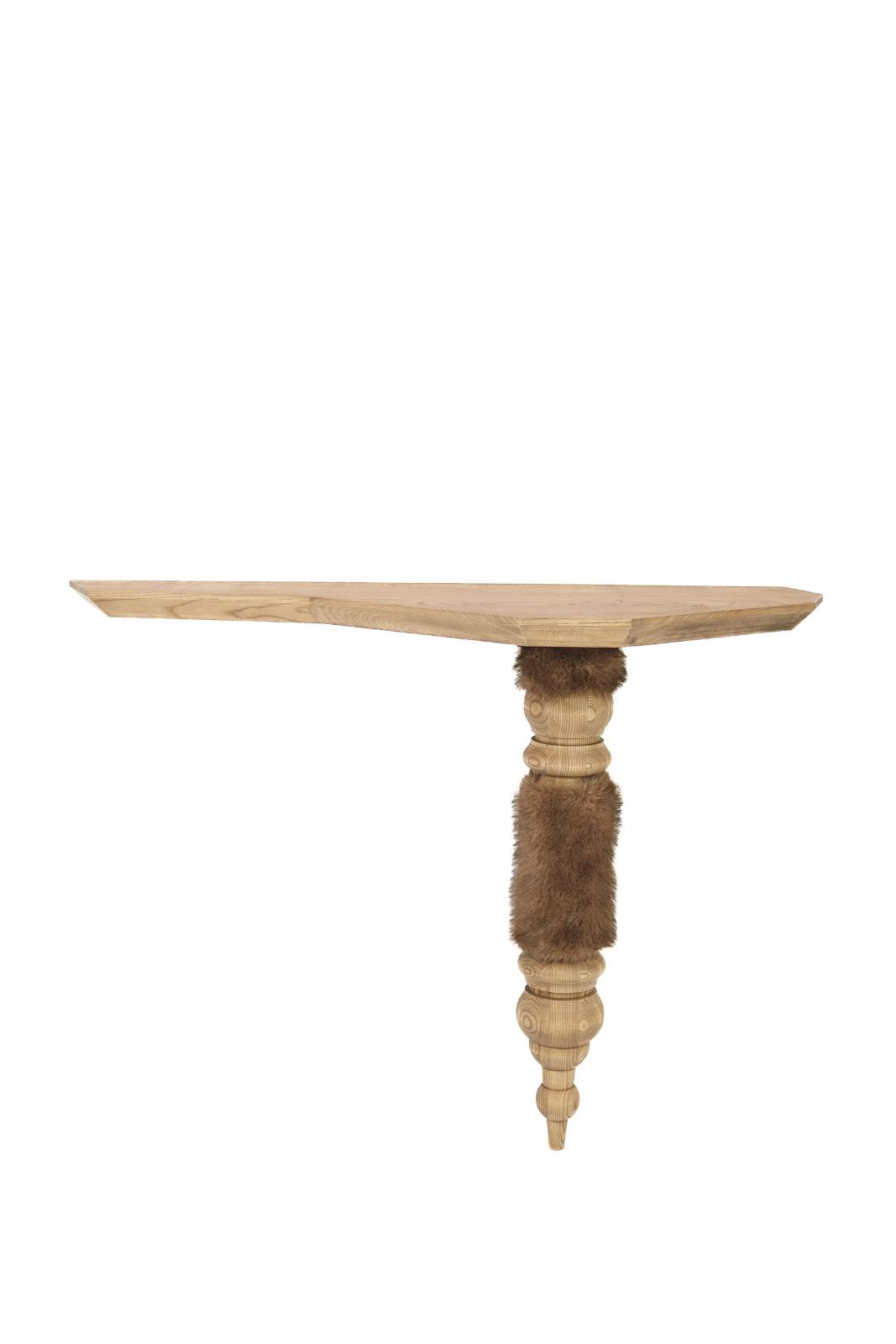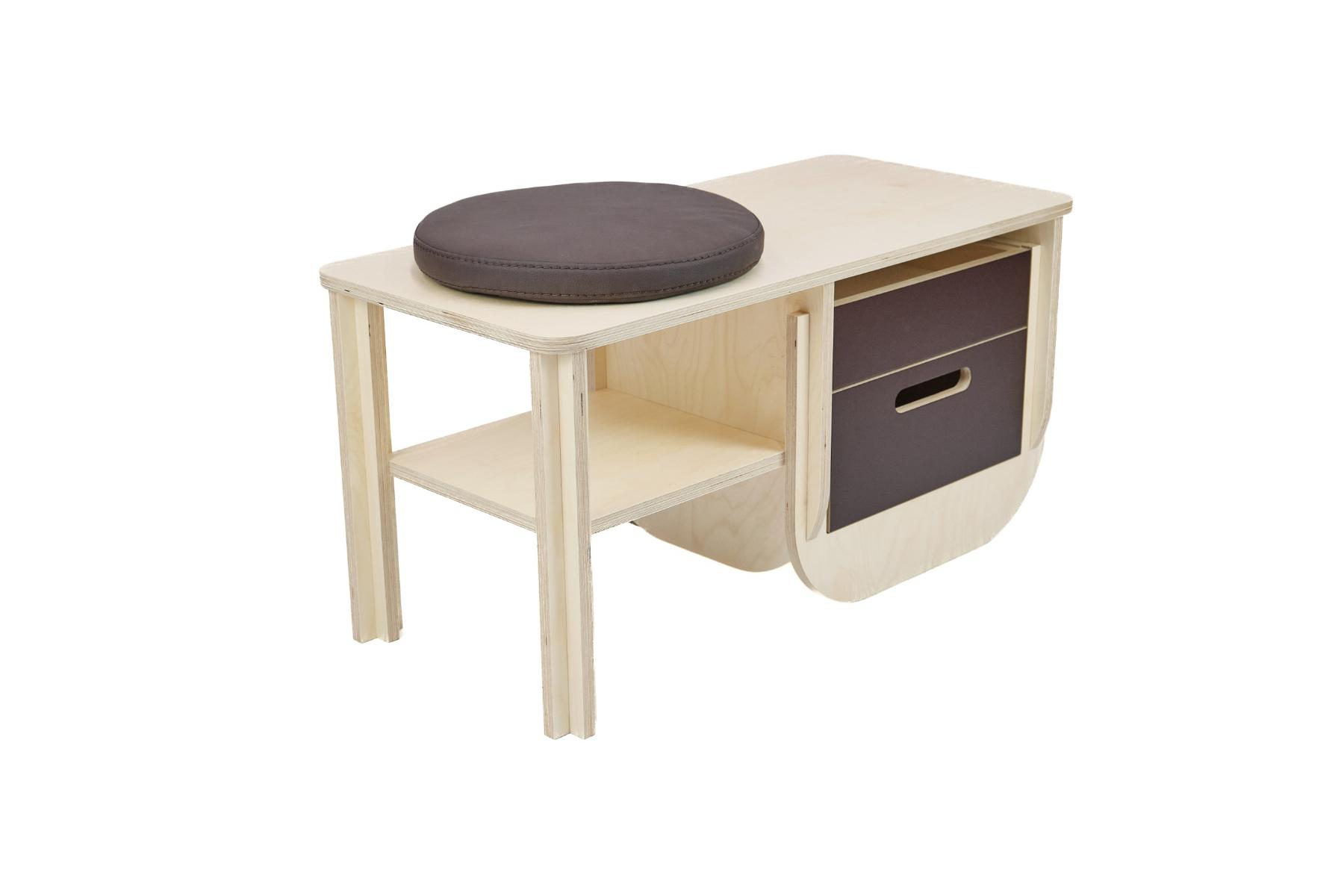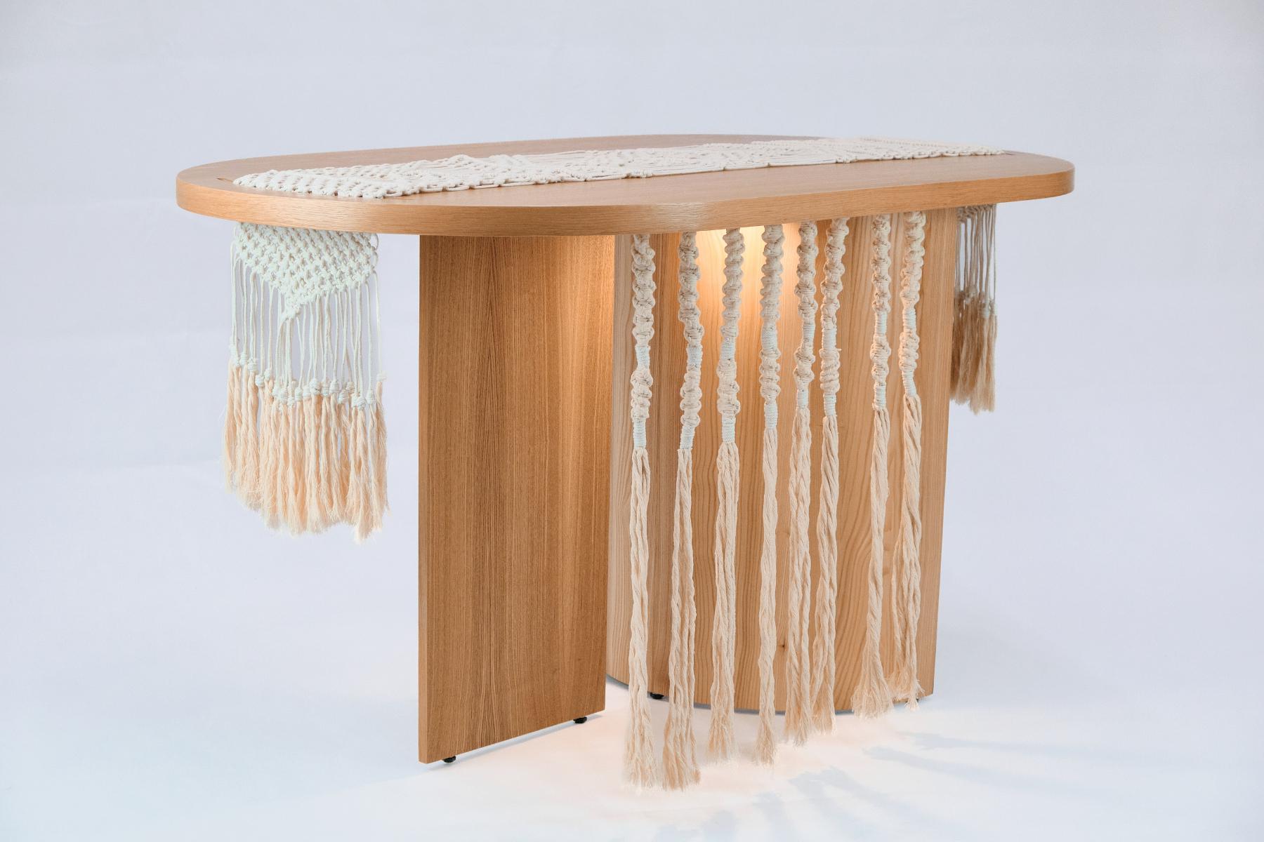 Журнальный столик «Солнечное сплетение» также выполнен из массива и шпона ясеня и дополнен подсветкой, а косички макраме – съёмные, и если их покатать в руках, это расслабит мышцы и снимет напряжение.