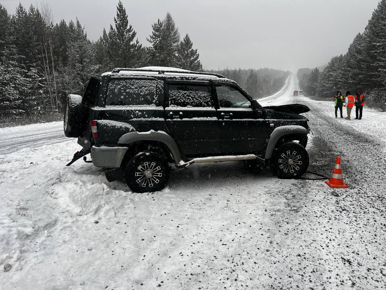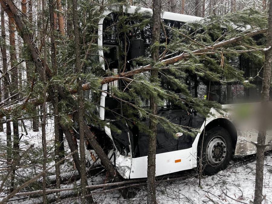 В результате ДТП второй автобус съехал с дороги в лесополосу и наехал на деревья. Медицинская помощь потребовалась пассажиру внедорожника и троим пассажирам автобуса, съехавшего с проезжей части. Всего в автобусах находилось 40 человек: они являются работниками одного из местных предприятий.