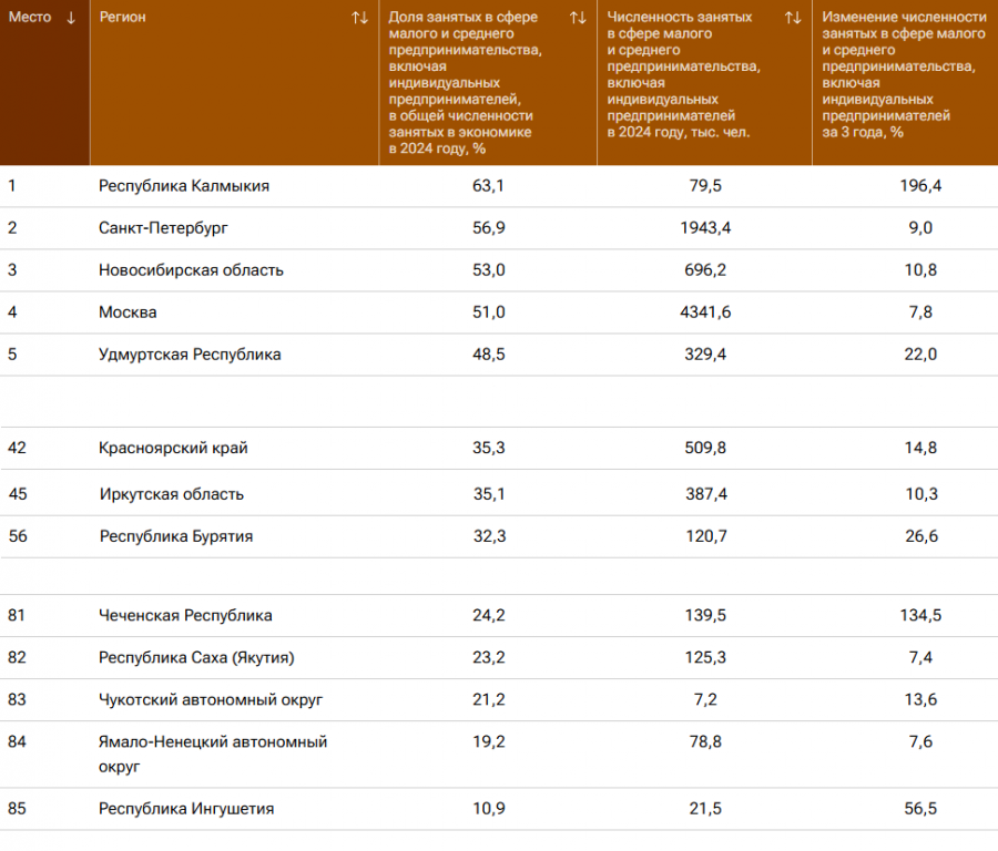 Среди регионов с наименьшими показателями выделяются Ямало-Ненецкий автономный округ, где в малом и среднем предпринимательстве занято 19,2% работающего населения, и Республика Ингушетия с долей всего в 10,9%. Также к аутсайдерам относятся Чукотский автономный округ (21,2%), Республика Саха (Якутия) (23,2%) и Чеченская Республика (24,2%).