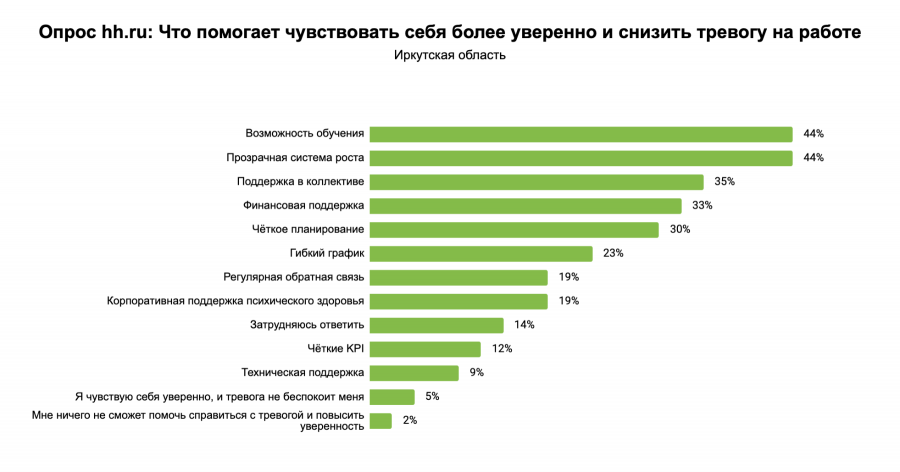 Согласно исследованию российской платформы онлайн-рекрутинга hh.ru, 95% работников Иркутской области в той или иной степени испытывают профессиональную тревожность. Только 5% опрошенных сотрудников полностью свободны от рабочих тревог, связанных с карьерой и трудовой деятельностью.