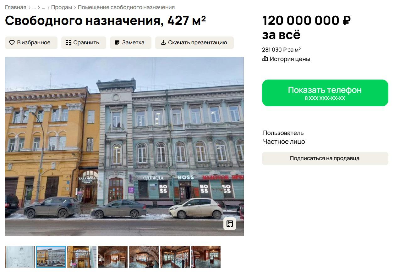Собственник решил расстаться с первым этажом и цоколем, где сейчас размещается «Ювелирная Галерея Базанова». Площадь лота составляет 427 квадратных метров.