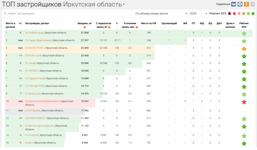 Группа компаний «Новый город» заняла первое место в рейтинге «Единого ресурса застройщиков» по объему введенного в эксплуатацию жилья за 2025 год в Иркутской области. Девелопер ввел 37 068 квадратных метров жилой площади, заняв 185-ю позицию в общероссийском рейтинге.