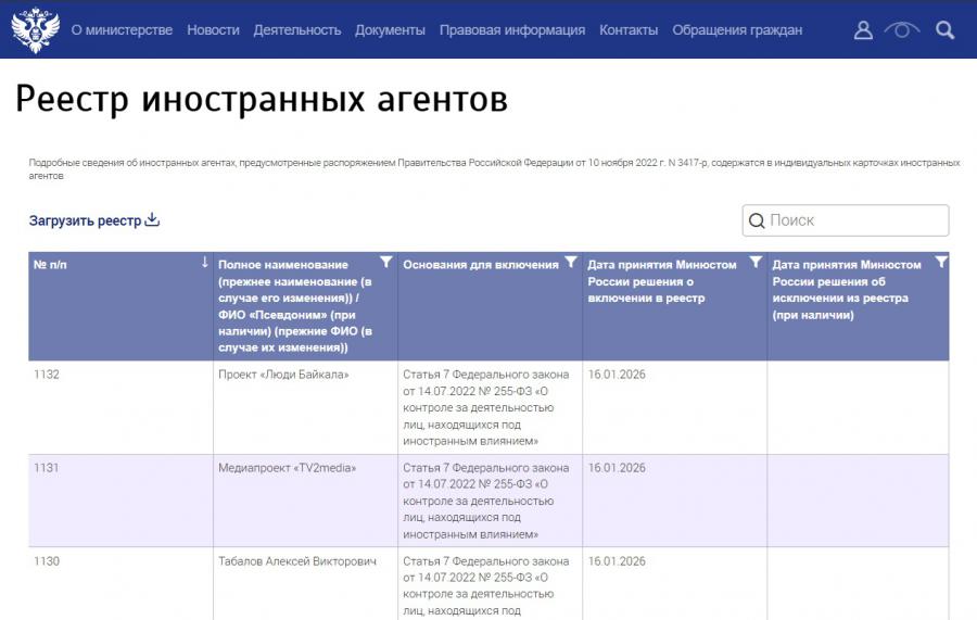 Минюст России обновил реестр иностранных агентов. 16 января в него включили проект «Люди Байкала»*, созданный журналистами из Иркутска.