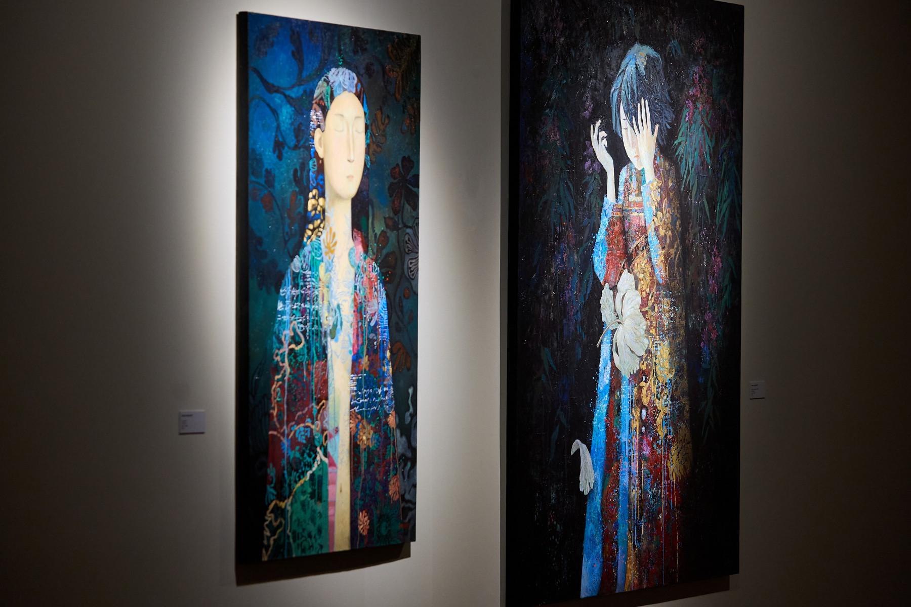Своего рода «краеугольными камнями» экспозиции стали четыре знаковых работы художника – два парных нефритовых будды в фас и в профиль, и две картины, символизирующие мужское и женское начала: «В глубине» и «В ее снах». Расположенные друг напротив друга, они «замыкают» залы галереи в круговую концепцию, держат выставочное пространство в едином смысловом контуре.