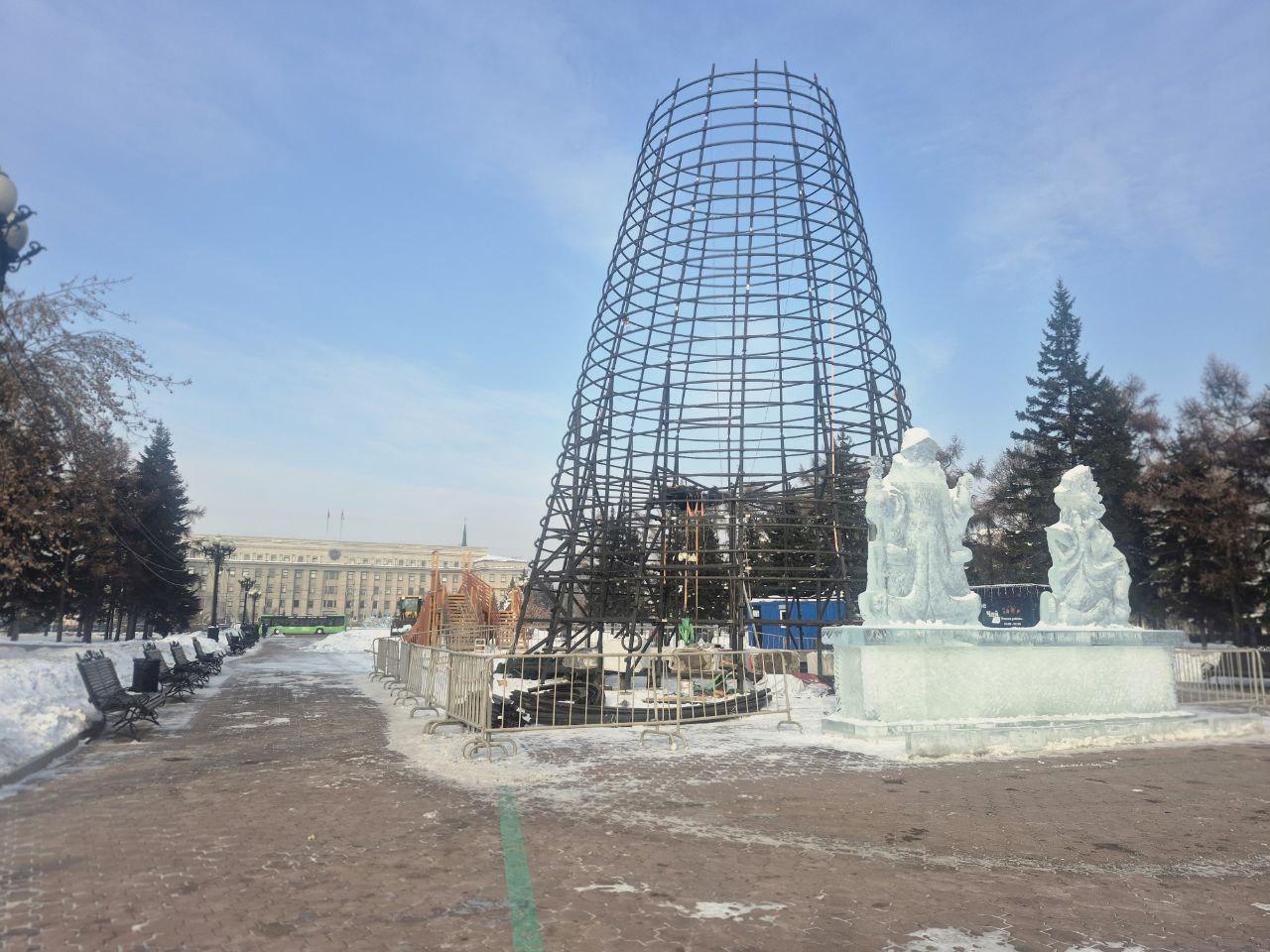 Главная 25-метровая елка Иркутска была установлена и торжественно открыта 20 декабря 2025 года. Вокруг нее в течение всего периода работала праздничная площадка с ледовыми скульптурами, горкой и резиденцией Деда Мороза.