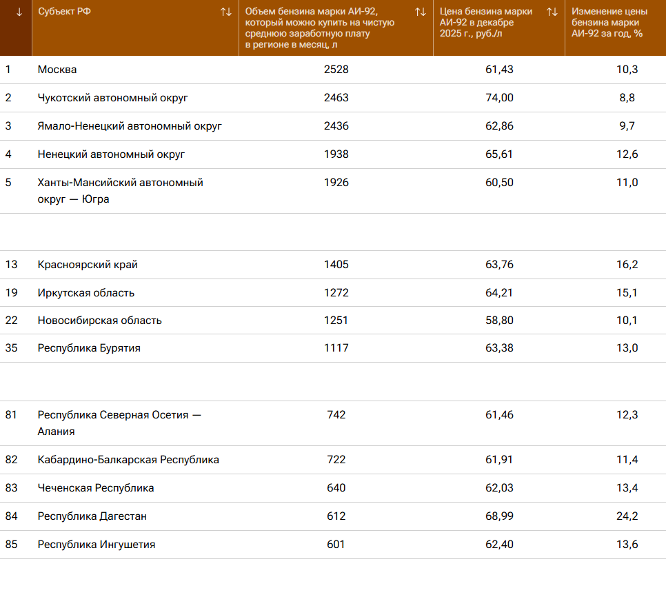 В Красноярском крае на среднюю зарплату можно купить 1405 литров бензина, в Иркутской области – 1272 литра, в Новосибирской области – 1251 литр, а в Республике Бурятия – 1117 литров.