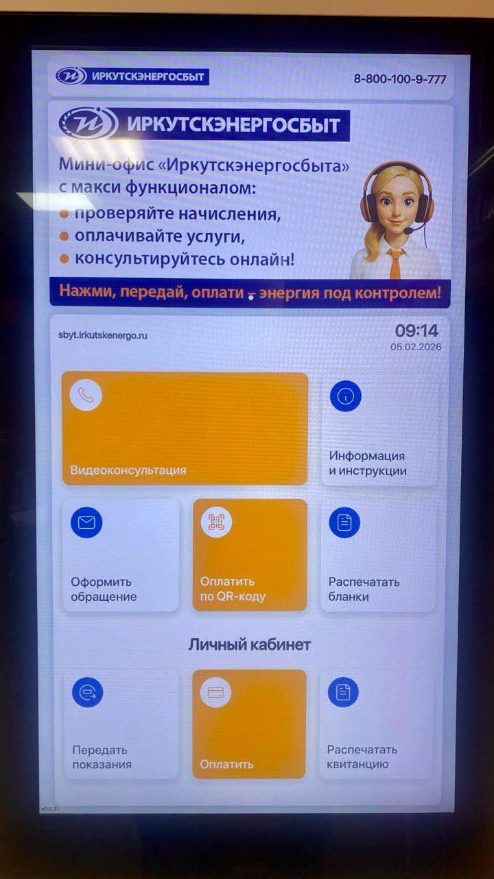 «Иркутскэнергосбыт» запустил пилотный проект дистанционного обслуживания клиентов в помещении МФЦ в Братске на улице Гайнулина. В офисе установлен специализированный видеотерминал, который позволяет получить полный спектр услуг.