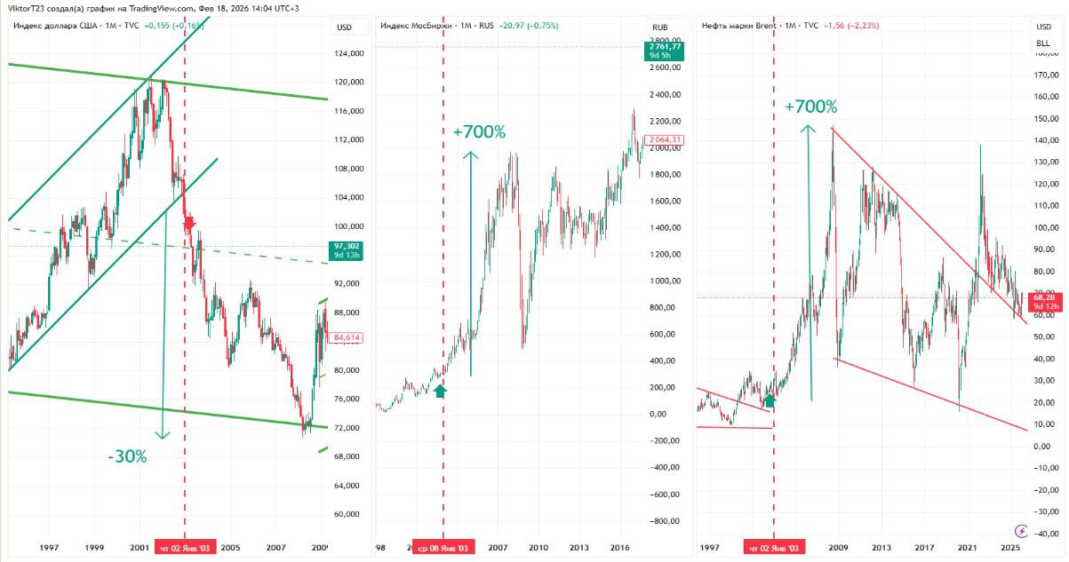 Эксперт напомнил, что предыдущая фаза ослабления доллара (2002–2008) привела к взрывному росту всех альтернативных активов: металлов, в том числе золота, нефти, ценных бумаг развивающихся рынков. Индекс Мосбиржи вырос на 700%, нефть – с 20 до 140 долларов.