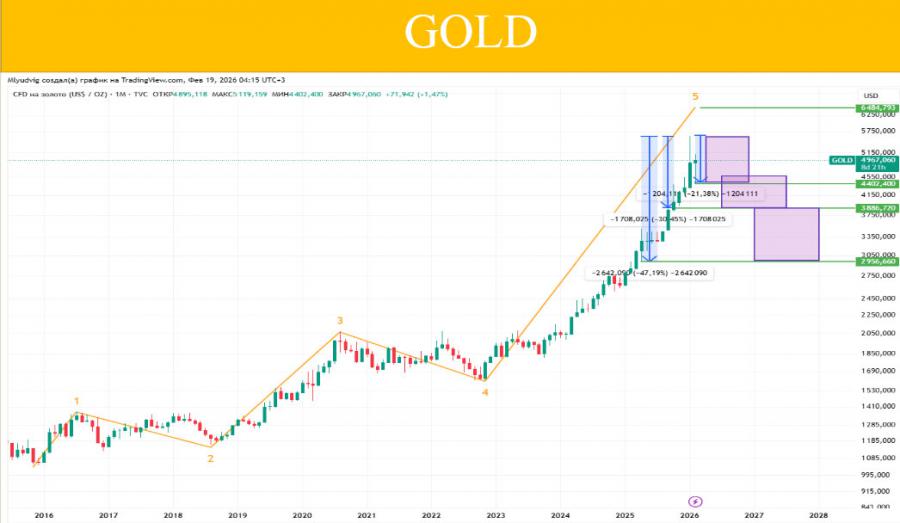 – С точки зрения технического анализа, золото находится на экстремально высоких уровнях. При себестоимости добычи в районе 1500–2000 долларов за унцию (этот уровень традиционно считается «дном», ниже которого цена упасть не может), текущие котировки выше 5000 выглядят безумно высоко. Лично я полагаю, что мы находимся вблизи временных пиков, и в ближайшее время ожидаю перехода в боковой тренд, который может занять от полугода до года.