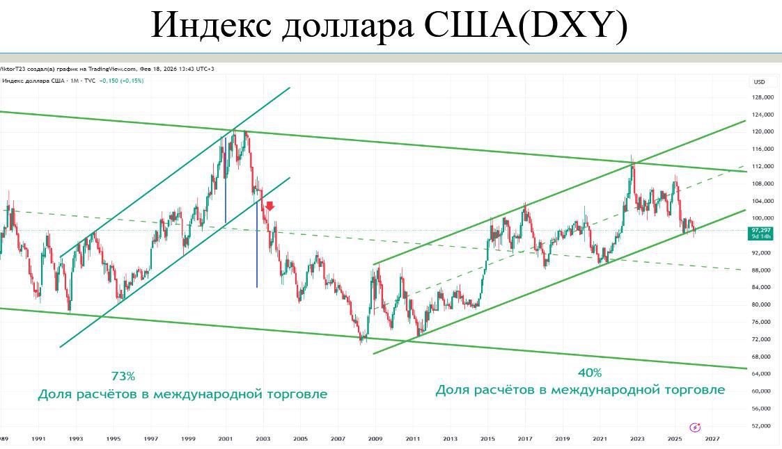 Эксперт напомнил, что предыдущая фаза ослабления доллара (2002–2008) привела к взрывному росту всех альтернативных активов: металлов, в том числе золота, нефти, ценных бумаг развивающихся рынков. Индекс Мосбиржи вырос на 700%, нефть – с 20 до 140 долларов.