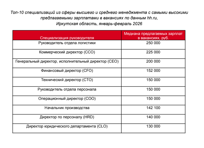 Всего с начала года работодатели Иркутской области разместили на hh.ru более 350 вакансий для высшего и среднего менеджмента, из них 35 предлагали доход от 300 000 руб.