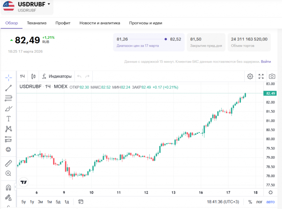 17 марта доллар торгуется на Мосбирже на уровне 82,49 руб.