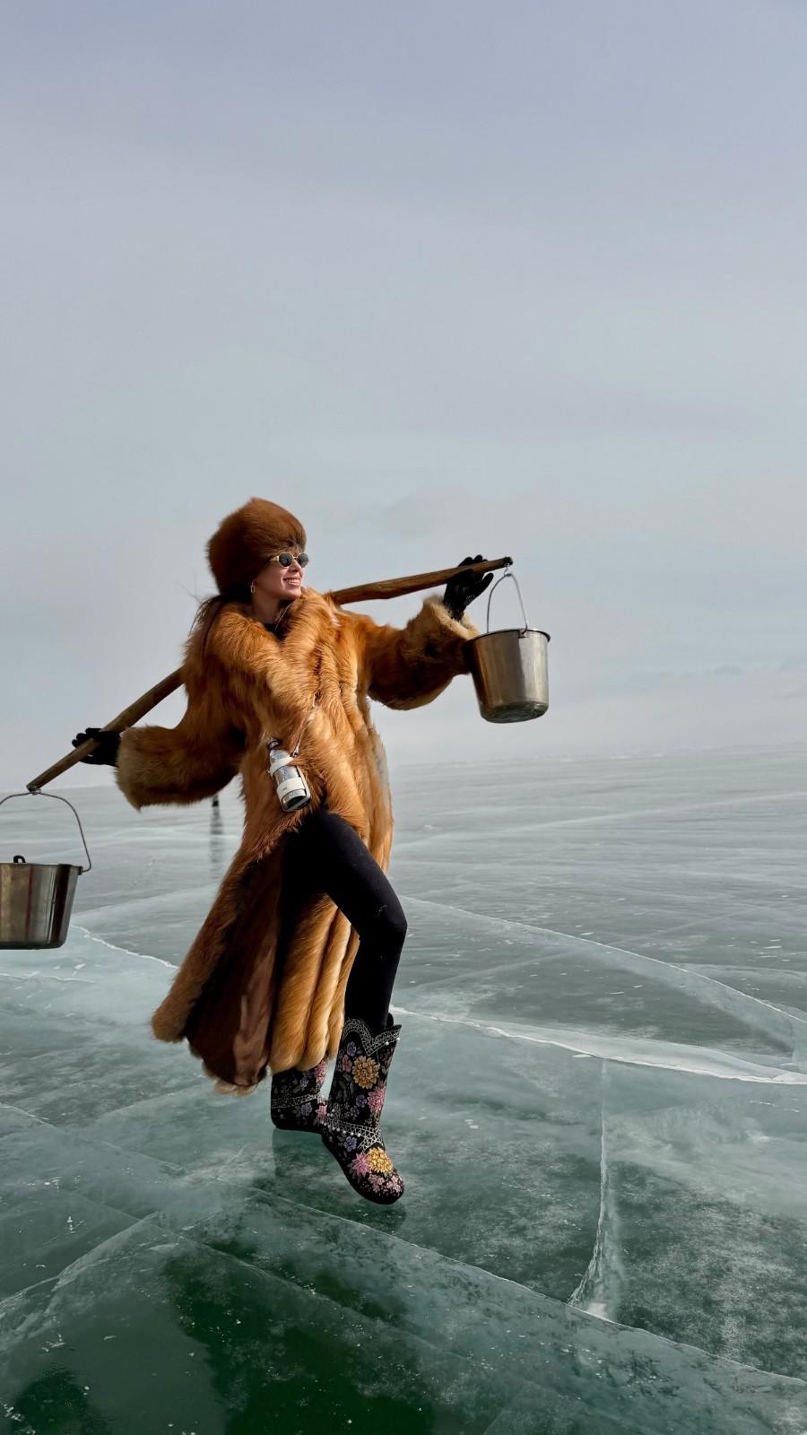 Пара прогулялась по поверхности озера, попарилась в бане, расположенной прямо на льду водоема. попробовали местную кухню. Также Полина Диброва сделала яркие кадры в русском стиле – в валенках, мехах и с коромыслом.