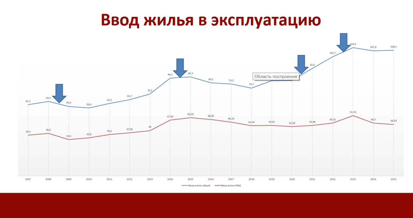 При этом парадокс многоквартирного строительства заключается в том, что объемы строительства многоквартирных домов (МКД) что в 2007, что в 2025 году остались практически на одном уровне – масштабного прироста за эти годы так и не произошло. Весь рекордный рост ввода жилья в стране обеспечивается исключительно за счет индивидуального жилищного строительства (ИЖС).