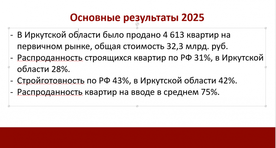 «Я не жду резкого обвала в 2026 году, но снижение объемов строительства на 10–15% – это уже решенный вопрос. Мы видим это по Иркутску: рынок переходит в режим "выживания". В работу пойдут только те проекты, в которых инвесторы уверены на 100% – с идеальной локацией, понятным продуктом и прогнозируемым спросом. Все крупные стройки поставлены на паузу и не скоро выйдут на рынок», – резюмирует девелопер.