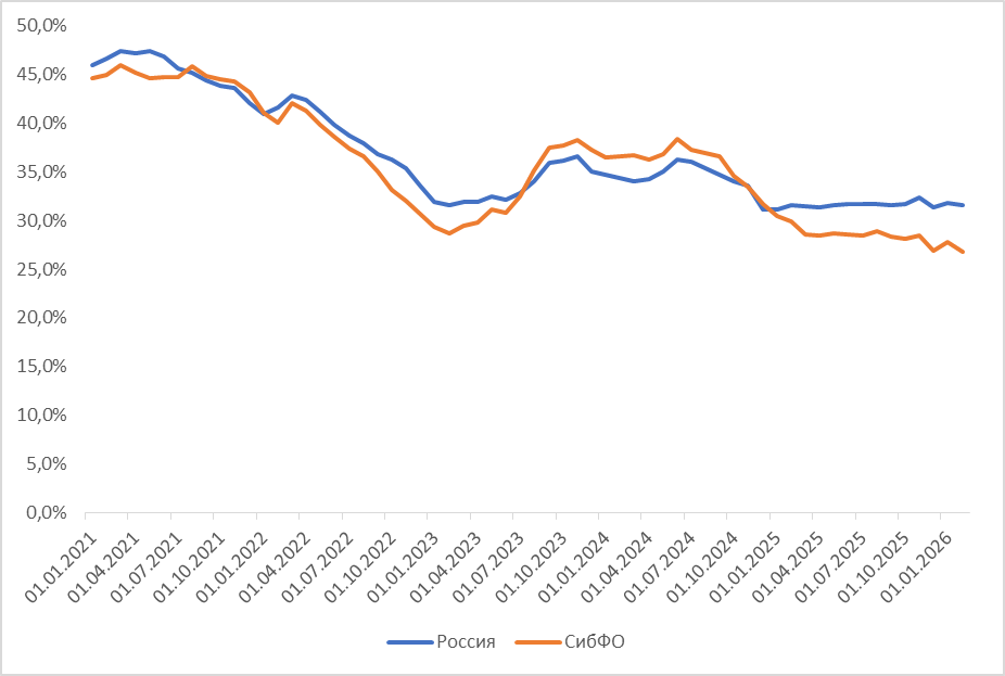 В 2025 году люди, зарегистрированные на территории СибФО, в 14,4% случаев брали ипотеку на жилье вне пределов своего округа. По этому показателю округ находится на третьем месте после Северо-Кавказского (21,9%) и Дальневосточного (17,2%).