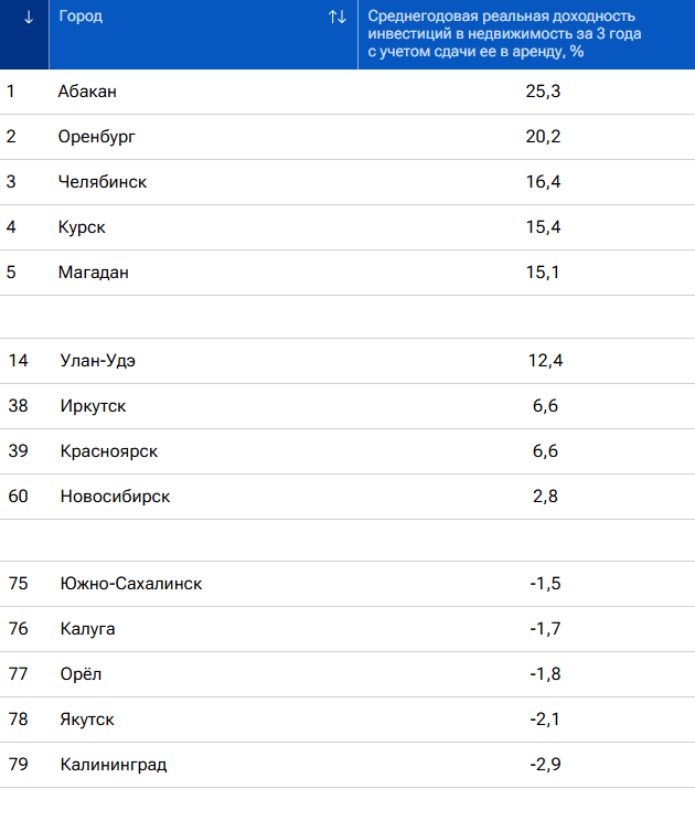 Улан-Удэ расположился на 14-м месте с доходностью 12,4%. Иркутск и Красноярск заняли 38-ю и 39-ю строчки с одинаковым результатом 6,6%. Новосибирск оказался на 60-м месте с доходностью 2,8%.