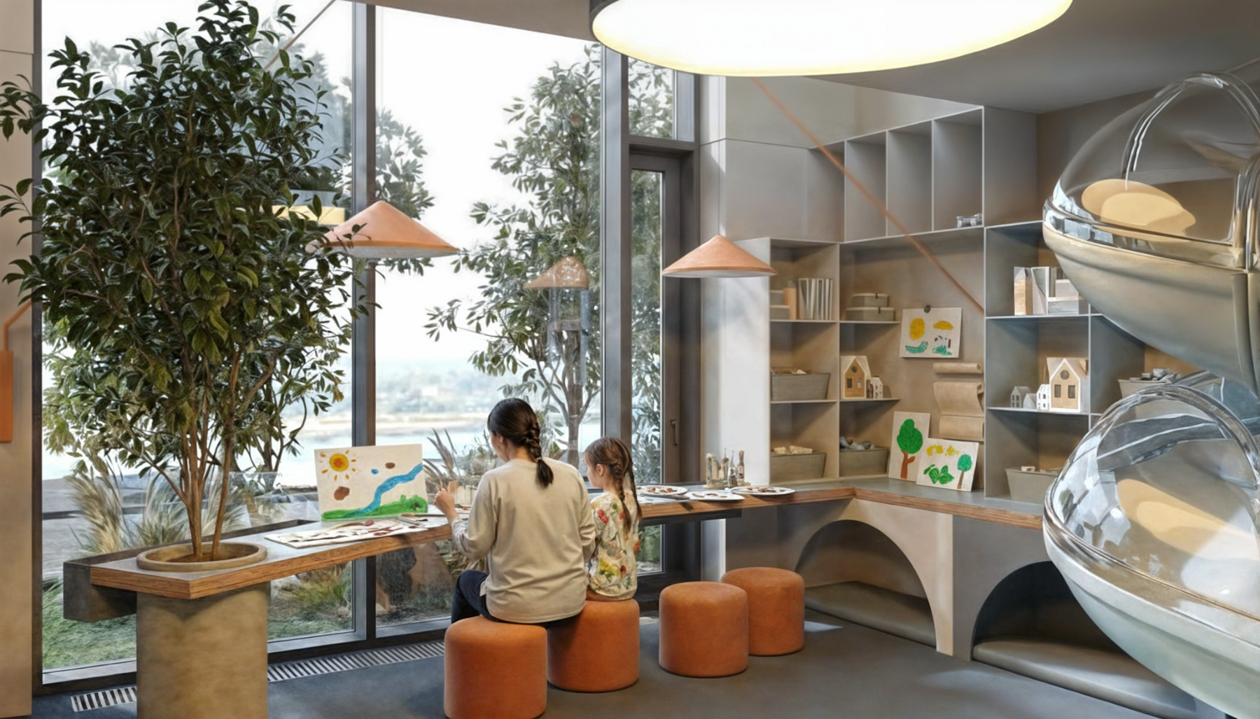 Эта же цель и у архитектуры проекта. Строгая геометрия зданий, вертикальные линии окон визуально вытягивают фасад, подчеркивая высоту и элегантность зданий.
