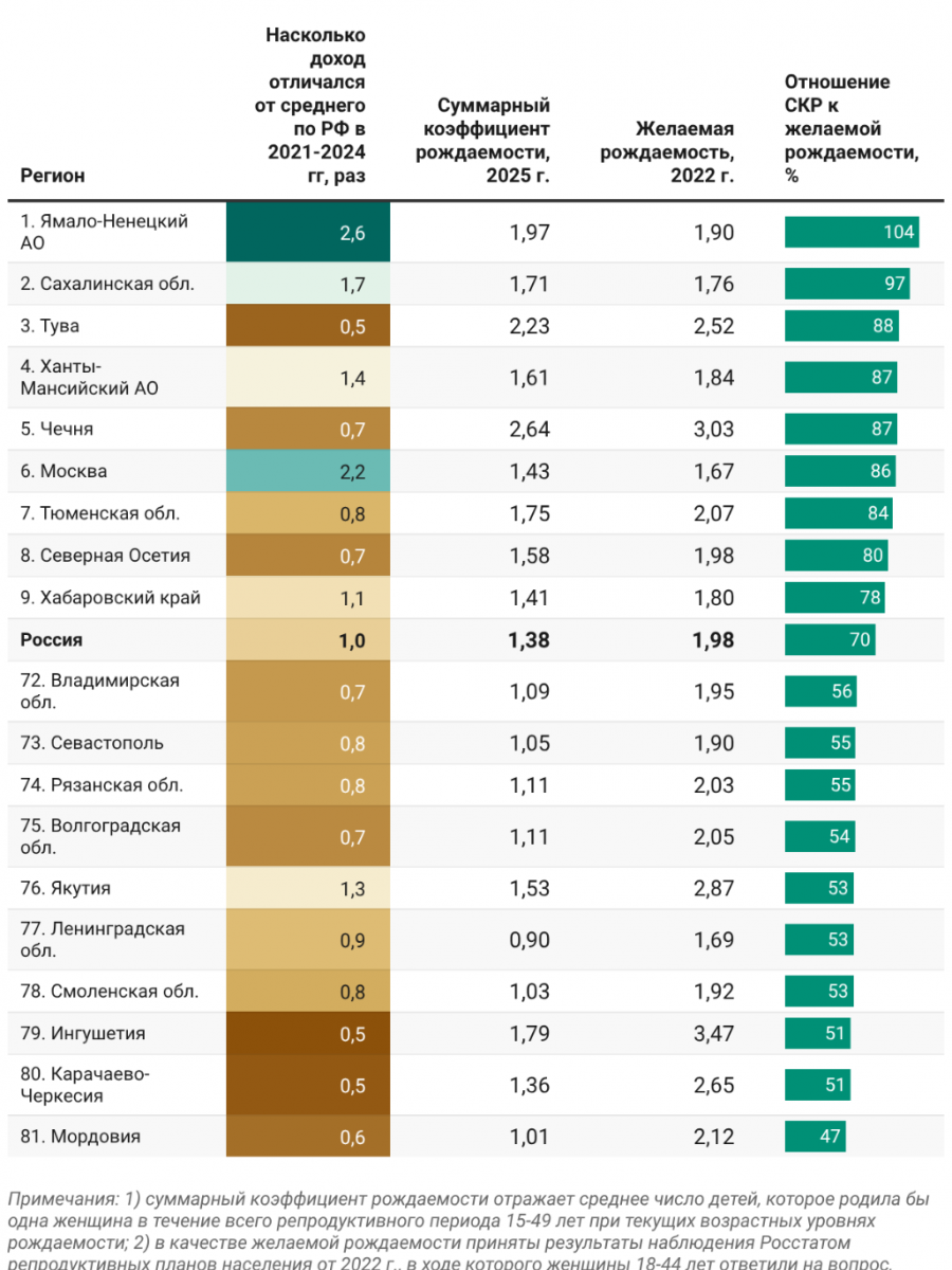 Анализ данных показал: разрыв между желаемым и фактическим числом детей меньше там, где выше уровень жизни. Лидерами по этому показателю стали Ямало-Ненецкий АО, Сахалинская область, Тува, Ханты-Мансийский АО, Чечня и Москва. Хуже всего ситуация в Мордовии, Смоленской и Ленинградской областях, Карачаево-Черкесии и Ингушетии, где разрыв достигает двукратного размера.