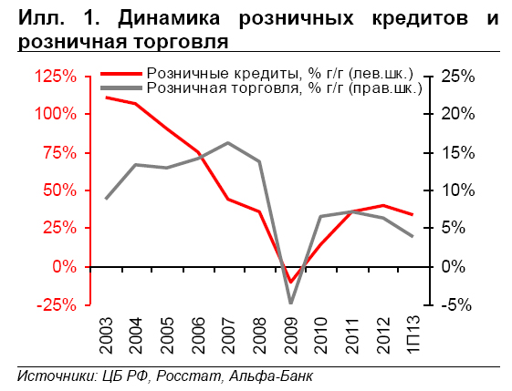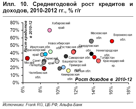 Сейчас розничное кредитование зависит преимущественно от динамики доходов. Спустя три года после кризиса рост кредитов сильно зависит от динамики доходов населения, указывая на повышенный интерес банков к регионам, где более четко прослеживается позитивный потребительский тренд. Однако у этого процесса есть оборотная сторона: возросла уязвимость банков к изменению настроений потребителей.