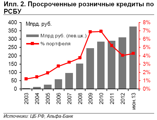 Снижение темпов роста банковских кредитов в последние месяцы вызывает опасения не только в отношении российского потребительского тренда, но и качества кредитов. Рост розничных кредитов замедлился с 39% г/г в декабре 2012 г. до 34% г/г в июне (см Илл. 1). Просроченная задолженность по РСБУ выросла с 4,0% в начале этого года до 4,3% в июне, указывая на то, что посткризисное улучшение качества кредитного портфеля подошло к концу (см. Илл. 2). В нашем ежемесячном обзоре за июнь мы проанализировали просроченную задолженность корпоративного сегмента, а сейчас рынок больше обеспокоен неблагоприятной ситуацией в розничном сегменте кредитования. Во-первых, по данным ЦБ и Национального агентства кредитных историй (НБКИ) 34 млн россиян, или 45% экономически активного населения, являются заемщиками. Во-вторых, по оценке Связного банка, доля розничных заемщиков, обслуживающих пять и более кредитов, выросла с 6% до 19% за последние пять лет.