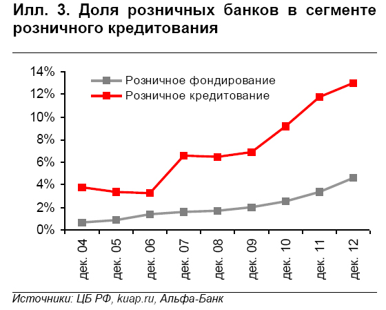 Одной из причин повышенного внимания к рискам в сегменте розничного кредитования является то, что нынешний рост обеспечивают небольшие банки. На 47 российских розничных банков, две трети активов которых приходится на розничные кредиты, приходится всего 3% совокупных банковских активов России, и при этом целых 13% рынка розничного кредитования, что заметно выше 7% в 2009 г. (см. Илл 3). Их присутствие на рынке розничных депозитов также заметно выросло за последние три-четыре года. Концентрация рисков розничного кредитования в этих небольших банках указывает на возможное усиление системного риска для банковского сектора в целом в случае ухудшения конъюнктуры розничного рынка.
