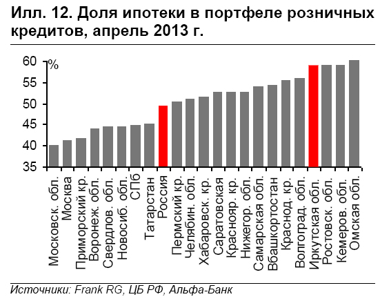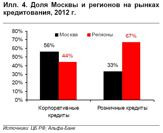 Розничное кредитование в центре внимания из-за замедления темпов роста и снижения качества портфеля. За последние шесть месяцев в России темп роста розничных кредитов замедлился с 39% г/г до 34% г/г, а просроченная задолженность выросла с 4,0% до 4,3%. В связи с этим на первый план выходят риски этого сегмента. В первую очередь, бросается в глаза усиление зависимости розничного кредитования от небольших банков: доля 47 розничных банков выросла с 7% в 2009 году до 13% в 2012 г.. Во-вторых, важен региональный разрез: хотя на регионы приходится 44% российских корпоративных кредитов, их доля в розничном кредитовании высока и составляет 67%, что указывает на особую уязвимость регионов к рискам в сегменте розничного кредитования.