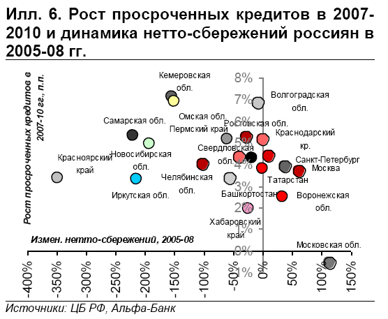 экономической структурой региона. Так, самый высокий рост просроченной задолженности наблюдался в регионах с высокой долей обрабатывающей промышленности в структуре региональной экономики (см. Илл. 5). Эти регионы были особенно уязвимы к падению мирового спроса. Впрочем, следует учитывать и степень перегрева кредитного рынка до кризиса: самый высокий рост просроченной задолженности наблюдался и в регионах, в которых в течение трех лет до 2009 г. наблюдалось самое быстрое снижение частных нетто-сбережений (разница между розничными депозитами и розничными кредитами) (см. Илл. 6).