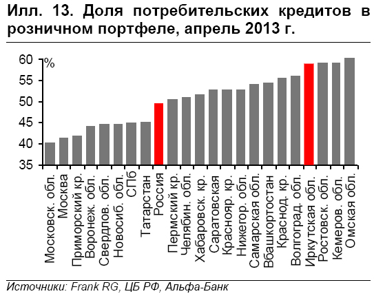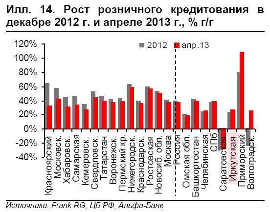 Кроме того, имеют значение и различия в темпах роста кредитного портфеля по регионам. Хотя в целом по России и, соответственно, в большинстве ключевых регионов, наблюдается замедление роста кредитования в сравнении с 2012 г., существуют и исключения. Так, в Волгоградской области и Приморском крае наблюдается стремительное ускорение роста кредитования (см. Илл. 14), идущее вразрез с рыночным трендом. В обстановке замедления экономического роста и розничного кредитования в России, мы считаем это тревожным сигналом.