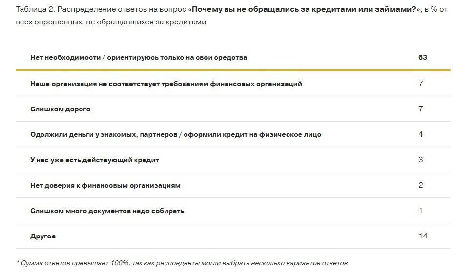 Две трети компаний-субъектов МСП не обращались за кредитами в течение последнего года. Среди тех, кто подавал заявку, треть получили отказ, в большинстве случаев без объяснения причины. Об этом свидетельствуют результаты всероссийского опроса руководителей предприятий, проведенного Аналитическим центром НАФИ совместно с Фондом Citi, Национальной ассоциацией участников микрофинансового рынка (НАУМИР) и Российским микрофинансовым центром (РМЦ) в феврале 2017 года.