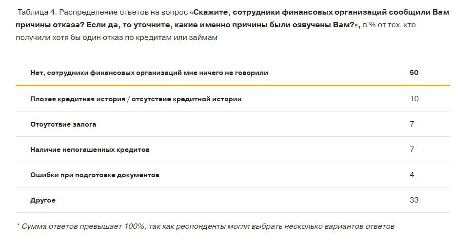 Каждый второй предприниматель за последний год подавал заявление на кредит один раз (51%), еще 22% - дважды, а 27% обращались три и более раз. Те, кто получили одобрение, не всегда получают всю сумму (средняя сумма заявки 8 млн. рублей, а средняя одобренная сумма почти в 1,5 раза ниже - 4,7 млн. рублей). Те опрошенные, которым было отказано в кредитах (32%), в половине случаев не получили разъяснений причин отказа (50%).